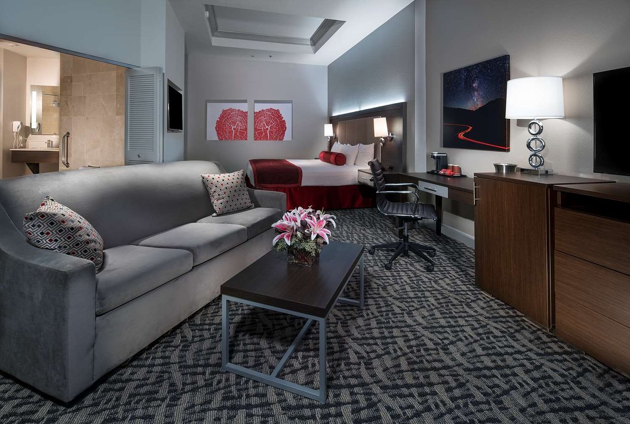 The Tower Suite is 574 square feet with one king bed and one sofa. Designed with couples in mind with a spacious living area that includes a designated work area and a bathroom perfect for two including a Roman tub, separate shower and double vanity.