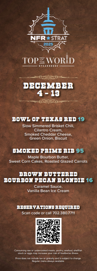 Experience the National Finals Rodeo from a whole new elevation at Top of the World, where award-winning cuisine meets unmatched 360° views of Las Vegas. During NFR week, enjoy a limited-time menu inspired by bold Western flavors and crafted exclusively for the season.